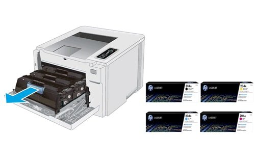 Máy in HP Color LaserJet Pro M154a sử dụng 4 hộp mực màu và với dãy đèn thông báo tương ứng từng hộp mực nằm hướng lên phía trên sẽ thông báo cho người dùng biết khi máy hết mực để lấy ra thay thế.