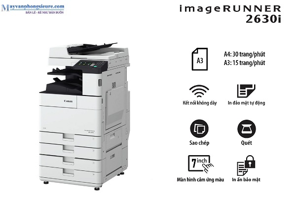 Máy photocopy Canon IR 2630i là dòng sản phẩm máy photocopy đa chức năng được trang bị màn hình cảm ứng 7 inch giúp người dùng thao tác dễ dàng và thân thiện. Với tốc sao chụp lên đến 30 trang /phút, đáp ứng tốt các nhu cầu in, photocopy và scan khổ giấy A3. Ngoài ra, máy photocopy Canon IR 2630i còn tích hợp nhiều chuẩn kết nối, kết nối mạng không dây WiFi, mạng có dây chuẩn RJ45 và cáp USB.2.0, giúp người dùng có nhiều sự lựa chọn trong việc kết nối và sử dụng sản phẩm này.