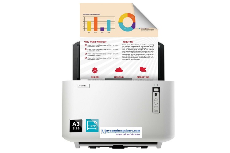 Máy scan Plustek SmartOffice T300 quét hai mặt khổ A3 với tốc độ 50 tờ/ 1 mặt, 100 ảnh/ 2 mặt / 1phút, tích hợp khay nạp giấy tự động ADF 100 tờ, hỗ trợ quét khổ giấy dài tới 5080 mm, tự động quét khi phát hiện có tài liệu, quét ra file PDF có thể tìm kiếm.